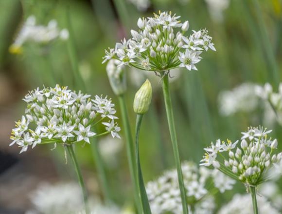 Beautiful, sweet-scented white flowers complement the gray-green leaves of Garlic Chives 'Geisha'. This variety is a 2015 All American Selections award winner. Foliage has a distinctive mild garlic flavor, delicious in soups, salads, sauces and spreads. Garlic Chives are an attractive plant for the herb, perennial or fragrance garden. Good cut or dried flower.
