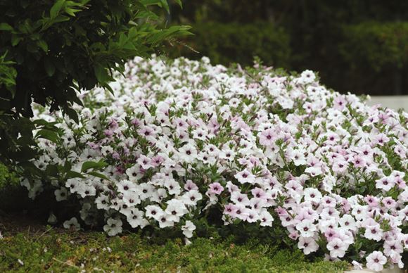Petunia x hybrida 'Tidal Wave Silver' is a very vigorous petunia, ideally suited for the landscape. Very easy to grow, no deadheading necessary. This Hedge Petunia will grow upward once it fills the space growing outward. Creates a carpet of color. Fertilize often. Are you a Fan Club member? See Wave-Rave.com