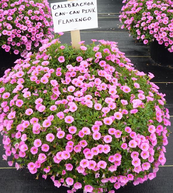 Calibrachoa hybrida 'Can-Can Pink Flamingo' provides a profusion of beautiful pink flowers with rose-veined throats on mounded, trailing, low-maintenance plants. Calibrachoa is best in containers including hanging baskets where it can display its fabulous trailing habit. Keeping plants too wet can lead to root rot diseases. Allow the top of the soil to dry before watering again. Self-cleaning, no deadheading necessary.