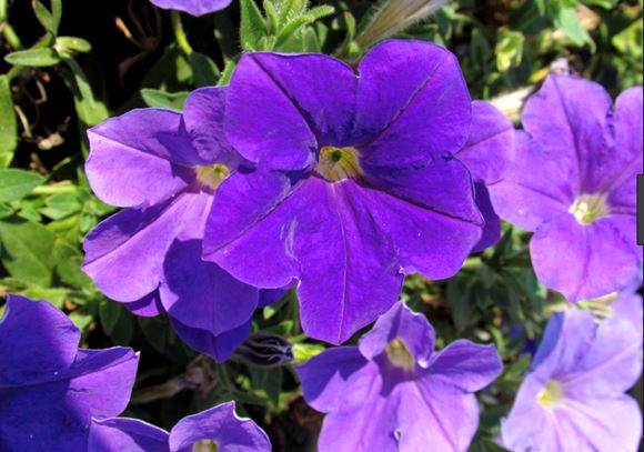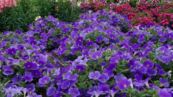 Petunia 'Surprise Blue Sky' blooms prolifically and becomes smothered in stunning mid-blue (lavender) trumpet shaped flowers. Blooms all season; fertilize often. Low maintenance. Trailing habit and low maintenance makes it a winner for both baskets and beds.