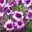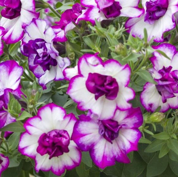 Petunia hybrida 'Veranda Double Nicola' sports small violet-rose and white double blooms on cascading plants. Blooms all season; fertilize often for best performance. The Supertunia line is bred for heat tolerance and outstanding performance. A winner for large hanging baskets or planters, and beds. Spreading Petunias are self-cleaning, no deadheading necessary.